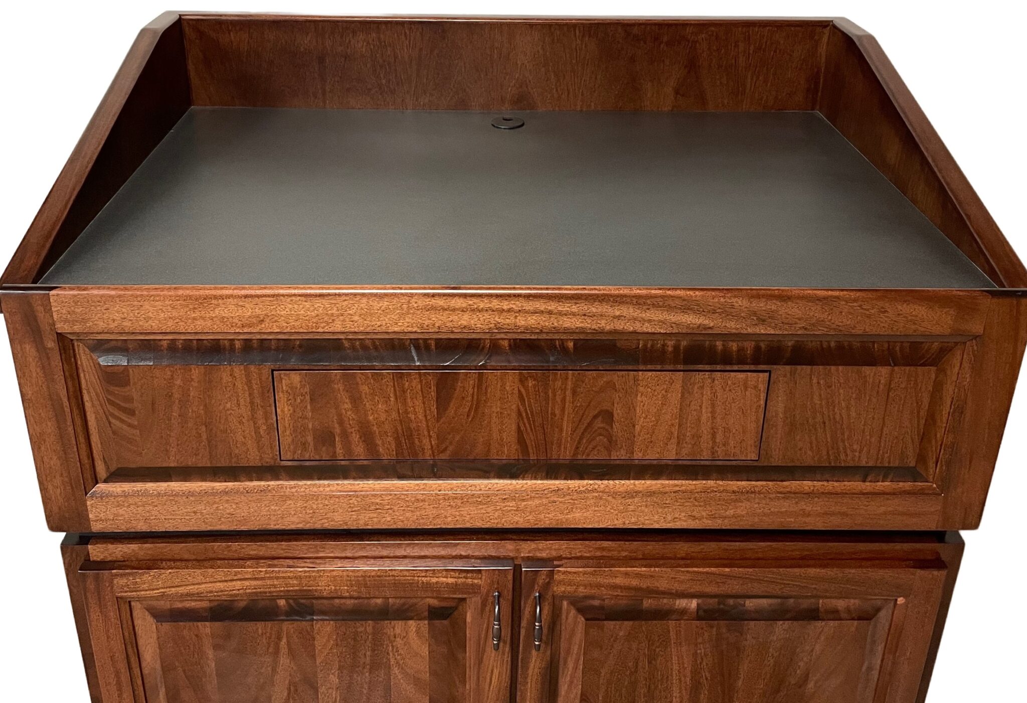 The Ambassador Evolution™Â is the ultimate multimedia lectern designed for professional presentations. Crafted from solid wood with classic square raised panels, this customizable wood podium and workstation offers a great experience for every speaker behind it.