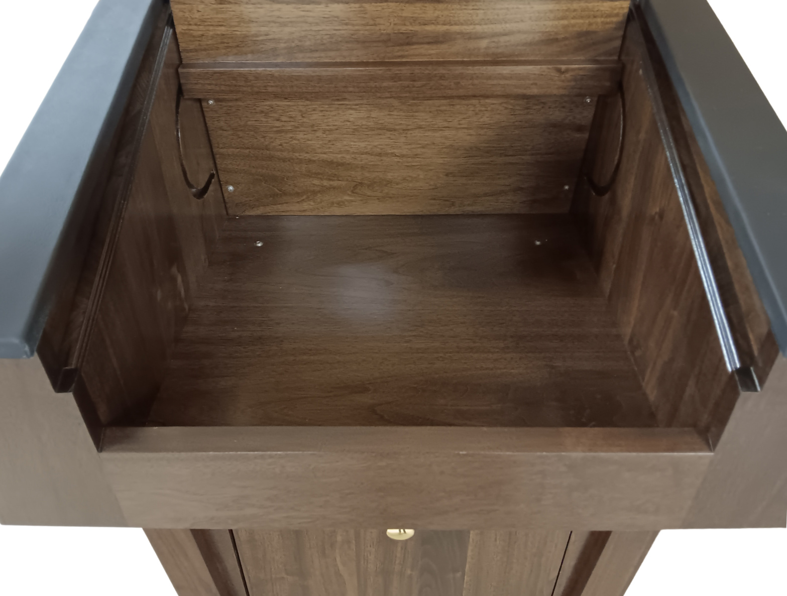 Everything is built for convenience: the amplifier station tilts out for easy access, while all wiring is hidden to preserve a sleek, cable-free appearance. The podium’s front panel uses embedded magnets to hold logos, plaques, or seals in perfect alignment.