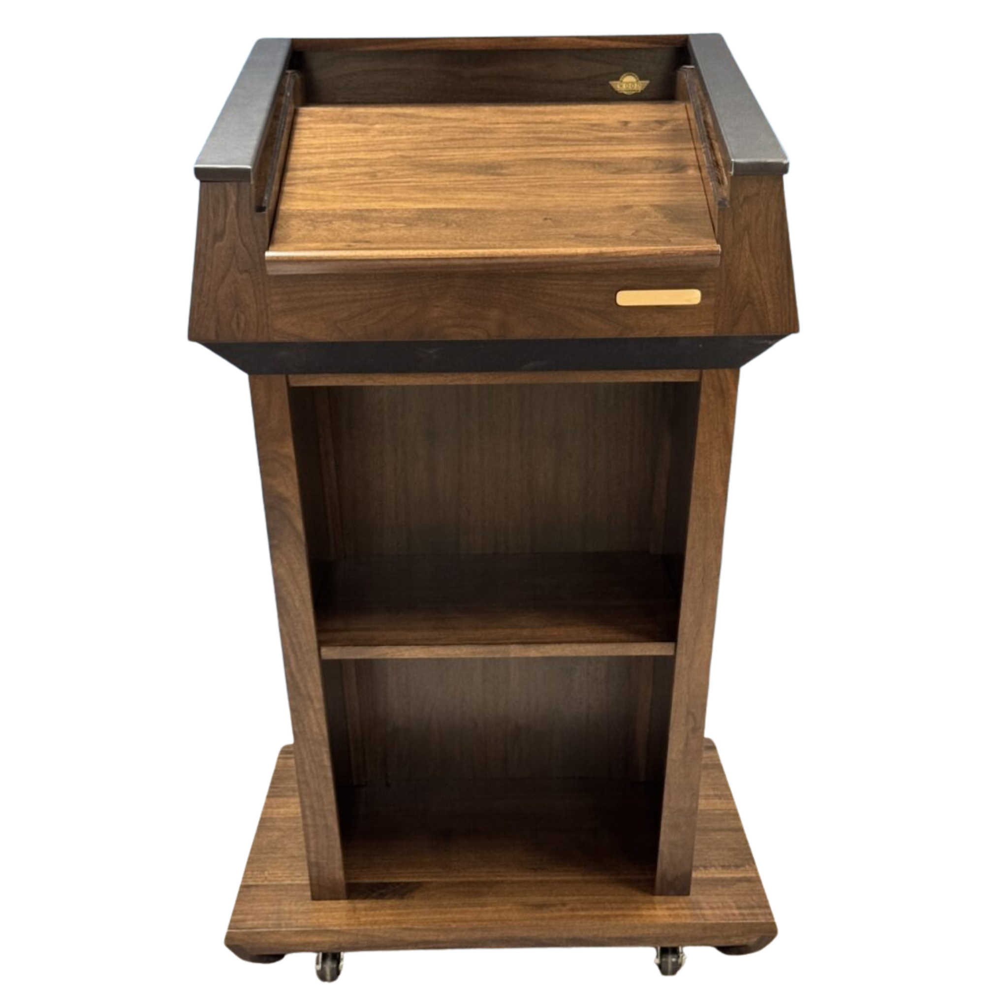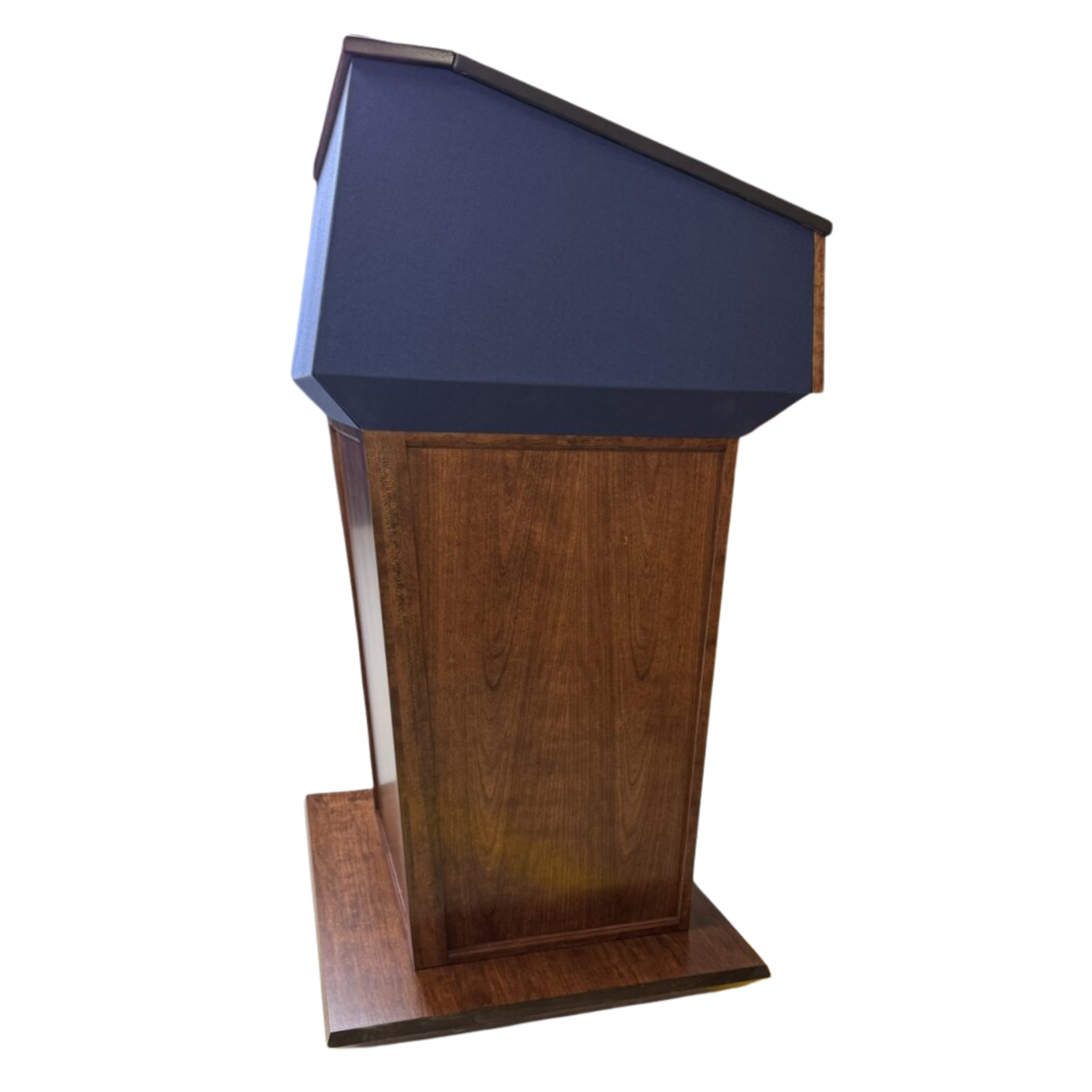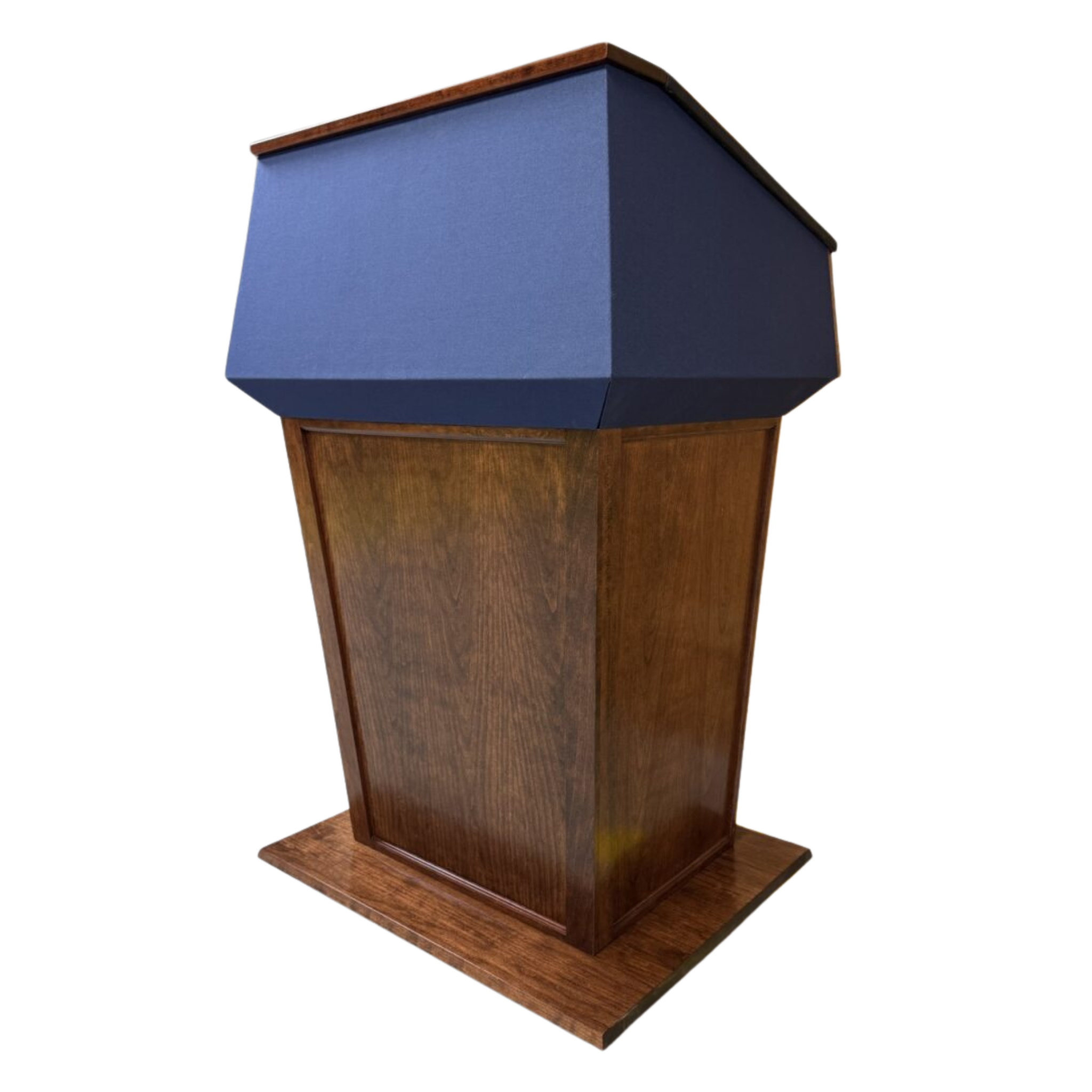 Handcrafted in Missouri from your choice of oak, cherry, walnut, or mahogany, this luxury podium features a self-aligning magnetic logo panel that allows seamless attachment of your custom emblem or seal. The expansive work surface is available with a fabric top in blue, red, or black, or you can upgrade to a matching hardwood surface for a fully coordinated finish.