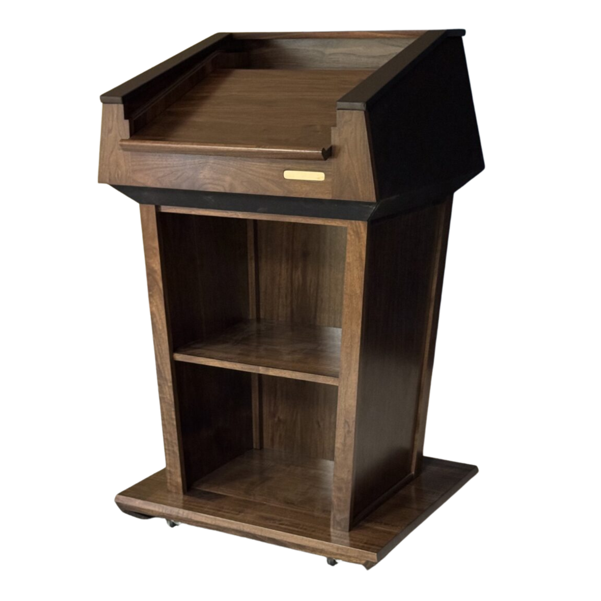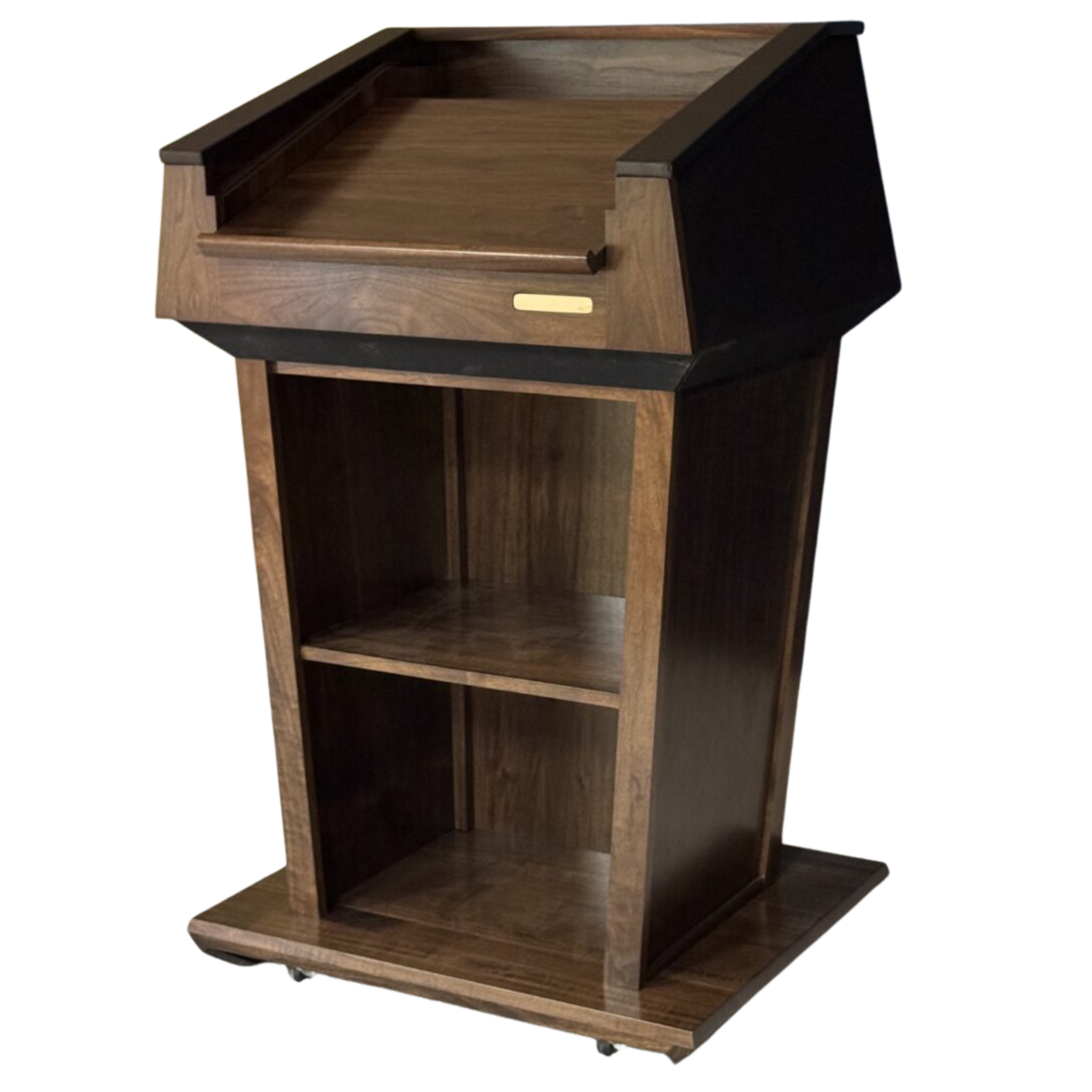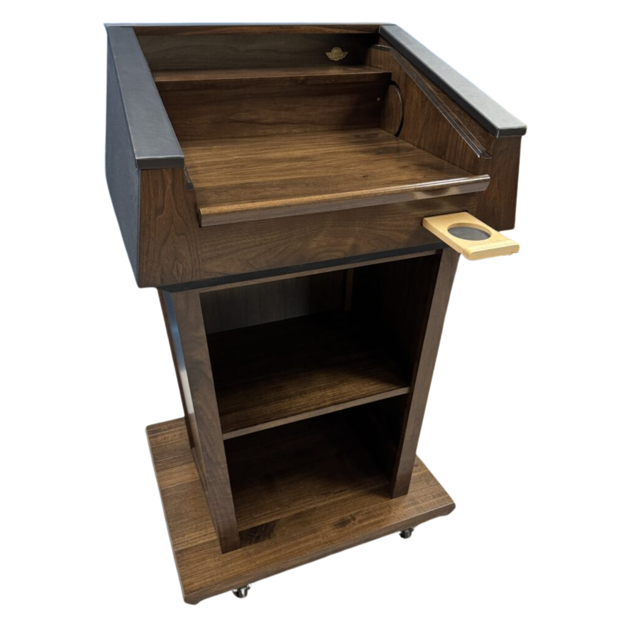Designed with both form and function in mind, the Presidential Plus™ includes a drop-down work surface that adjusts between angled or flat positions—perfect for lecture notes or laptop use. The podium’s leather-wrapped handrails, built-in storage compartments, and full interior shelf provide the perfect balance of luxury and practicality.