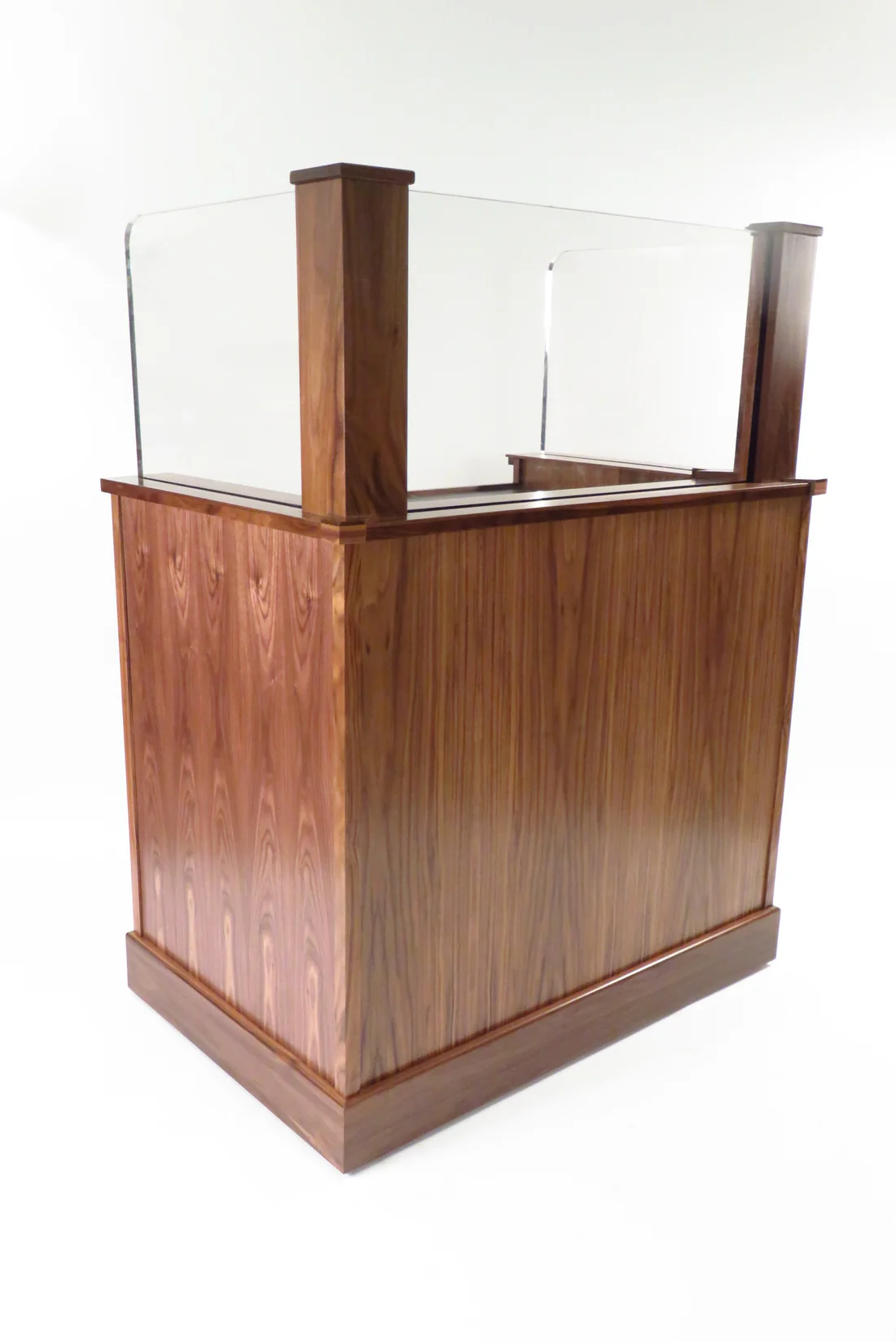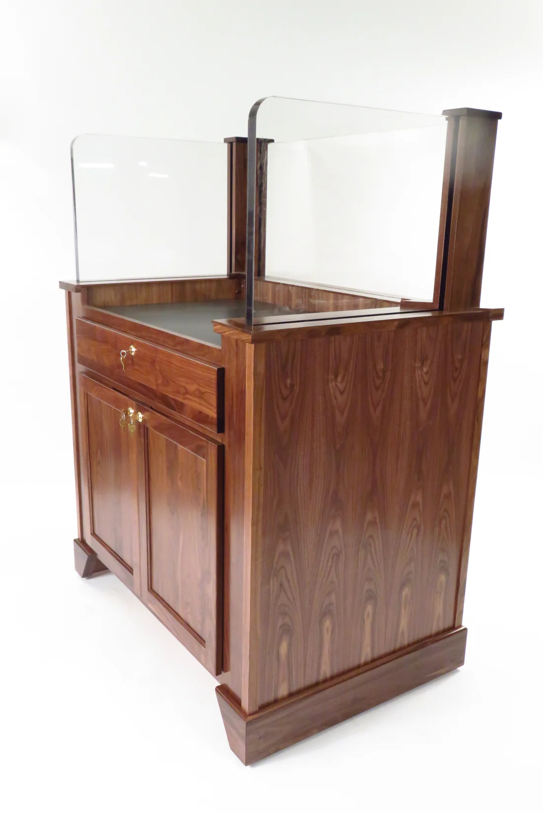 Designed and handcrafted in Missouri, this bullet-resistant security podium is wrapped in your choice of premium hardwood finishes including oak, cherry, character maple, or walnut, making it both highly protective and visually refined. The magnetic front logo panel lets you proudly display your seal, emblem, or agency logo with clean alignment and no visible fasteners.