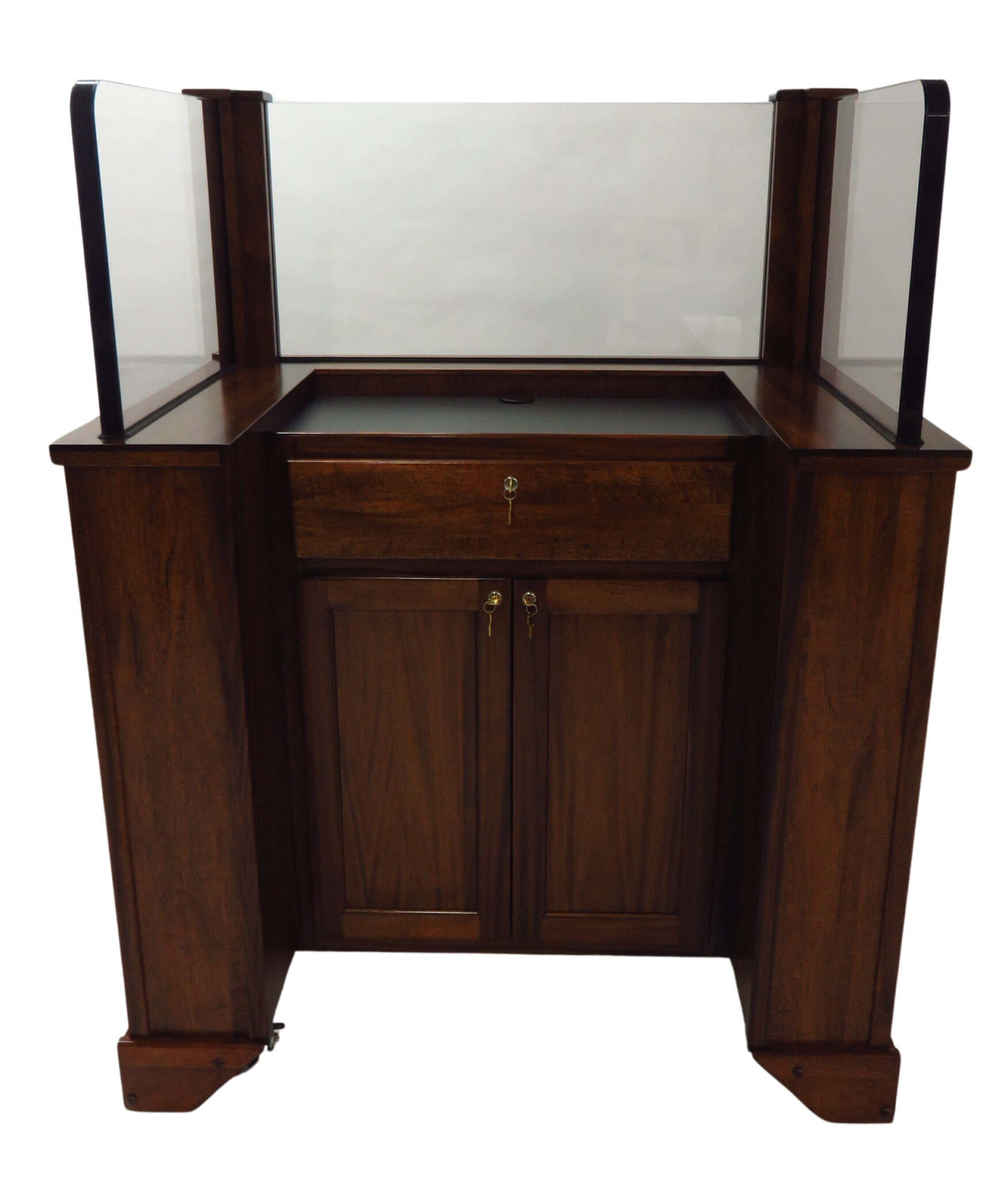 - Dimensions: 44″W x 33.5″L x 42.5″ to work surface, plus bullet resistant glass material (Final height 56″, 62″, or 66″ depending on glass height)