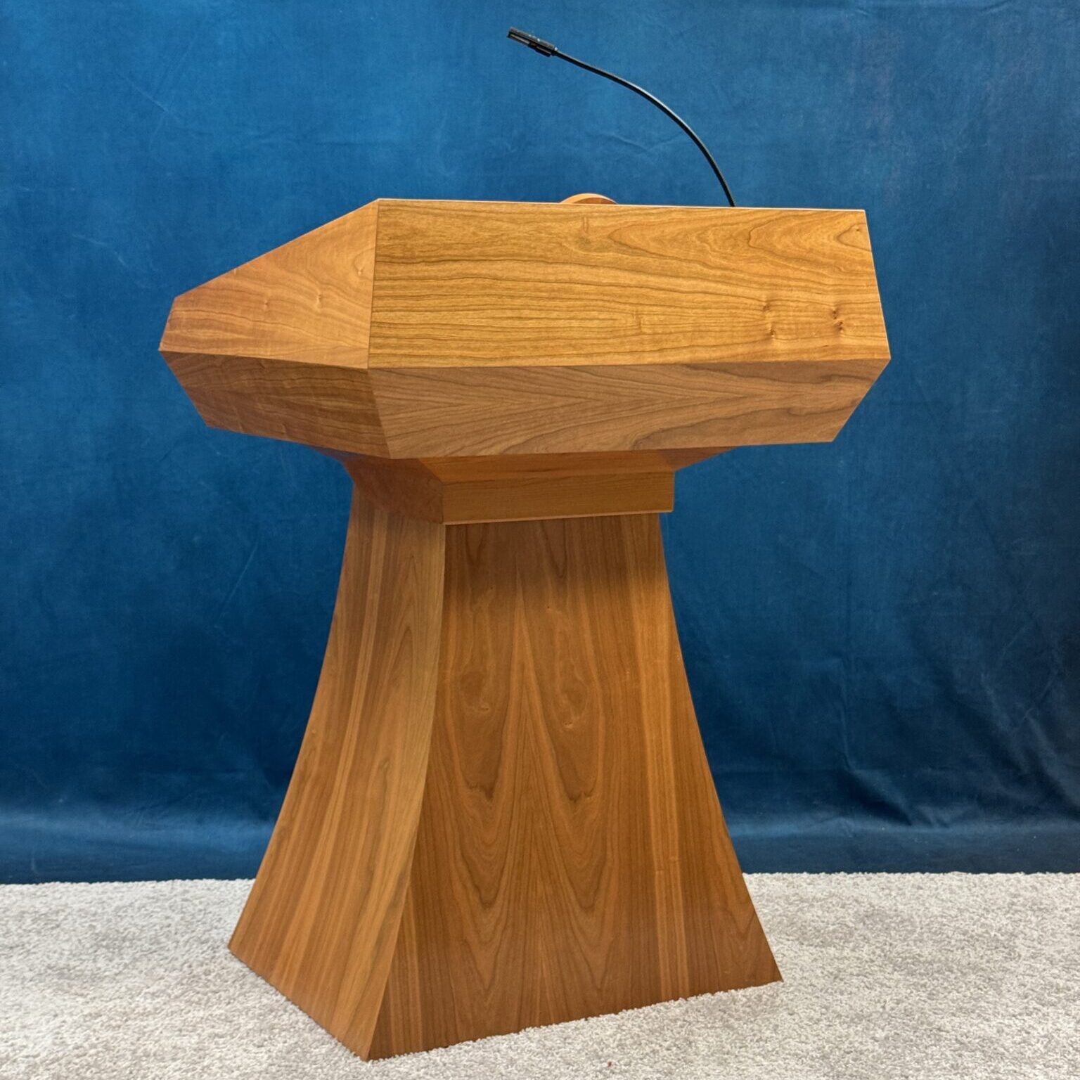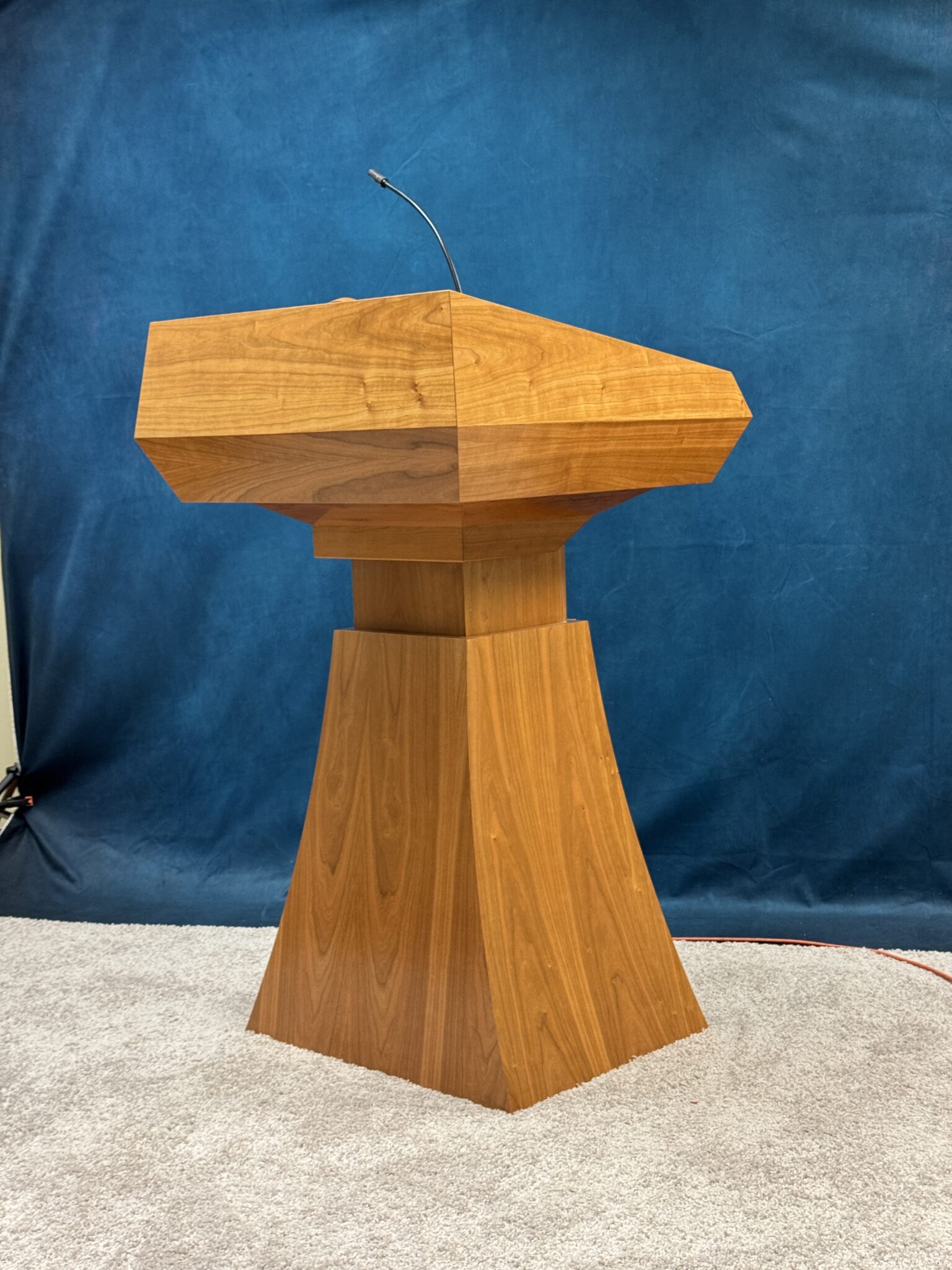 Perfect curves, compound angles, and proprietary construction methods define the distinctive silhouette of the StatesMan AutoGlide™ Lectern. Each unit is handcrafted using furniture-grade hardwoods and wood solids, creating a seamless, one-piece pedestal design that delivers both visual impact and structural integrity.