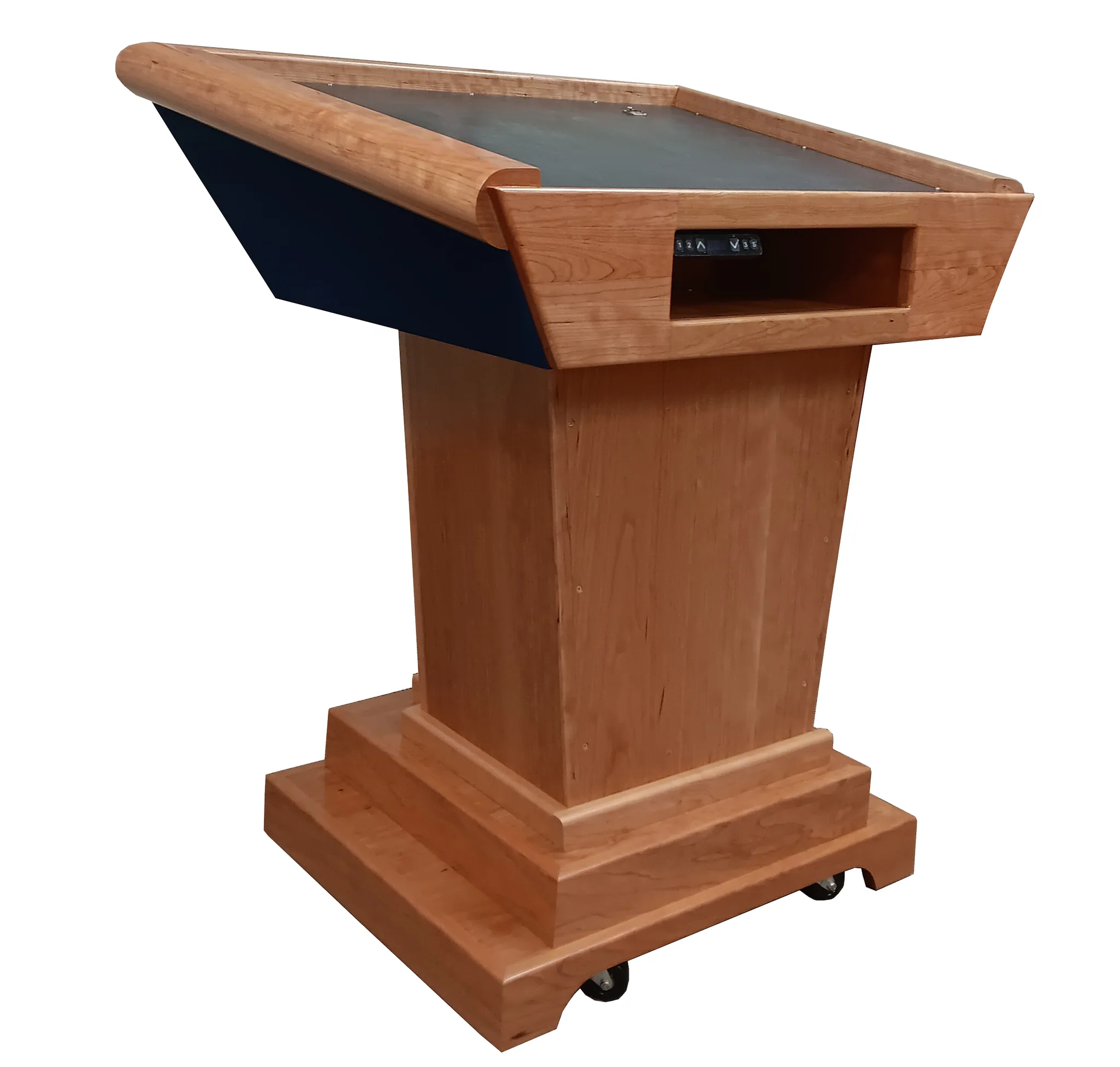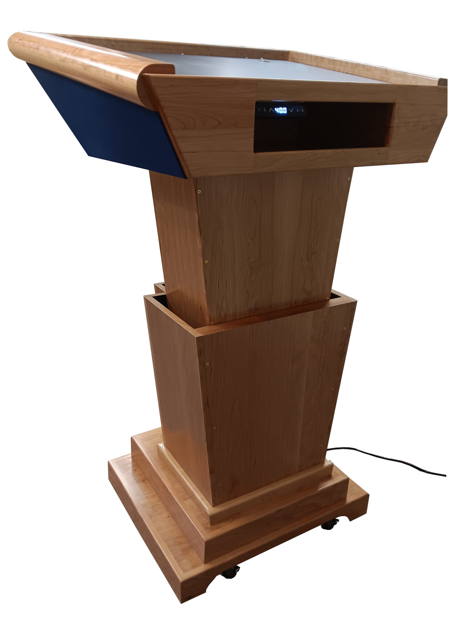 Each Titan Lift™ Podium is 100% handcrafted from solid hardwood — available in Oak, Cherry, Character Maple, or Walnut — and finished with precision woodworking techniques that highlight the natural beauty of American wood. Choose between a wood or fabric-covered top in Black, Red, or Blue to complement your space.